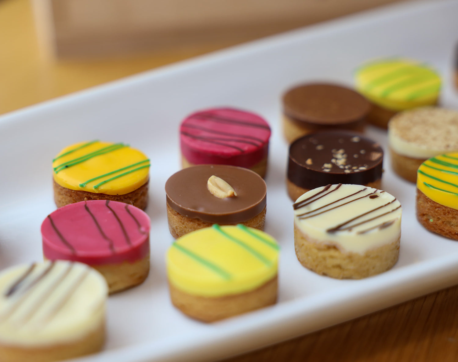A bite-sized shortbread cookie, topped with creamy filling and covered in chocolate.